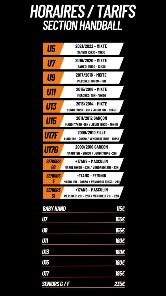 HANDBALLHandball Horaires voir le tableau ci-dessus LieuGymnase MunicipalQuartier Saint RochA côté du collège ContactHugo RUFFEL :06.34.01.77.62bvhcpeyrollais@gmail.com InscriptionsOuvert à tous à partir de 3 ansLes Inscriptions se font sur le lieu de l’entraînement à voir avec le les entraineurs.